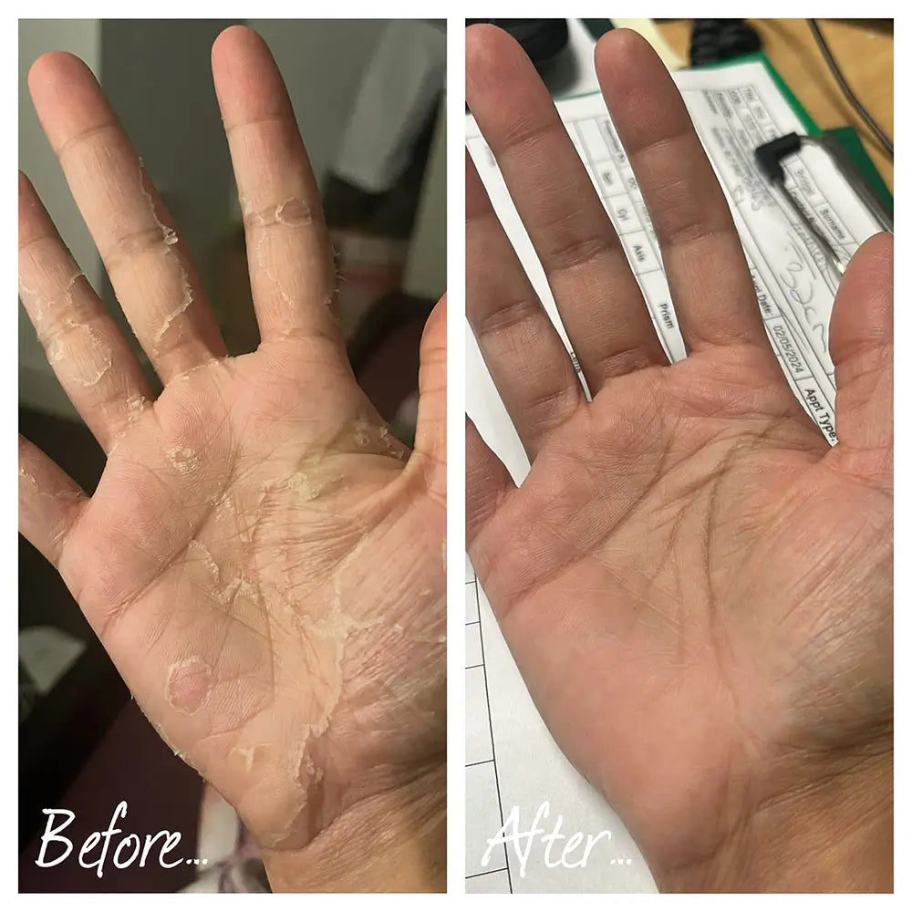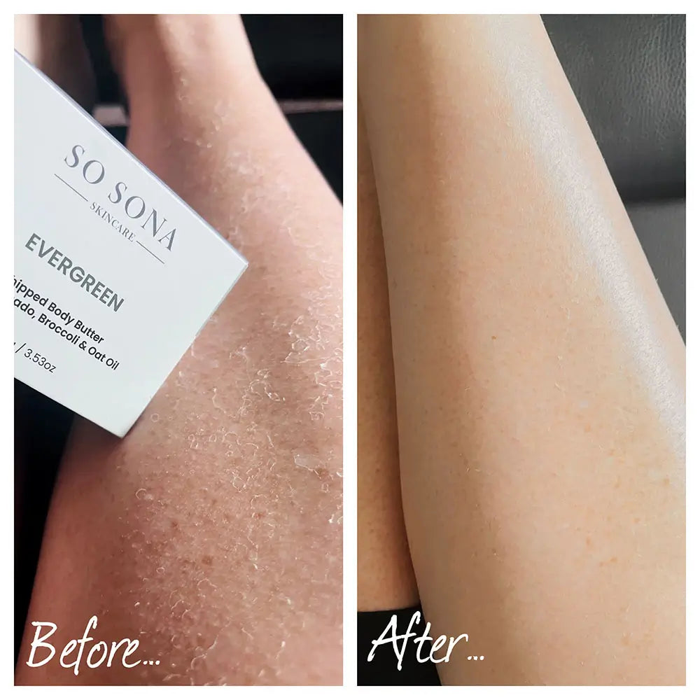 - Apply with Care: Gently massage the warmed body butter onto your skin in a circular motion. Focus on dry areas, or areas of concern such as psoriasis patches, or dry areas like elbows, knees, and heels for extra hydration..